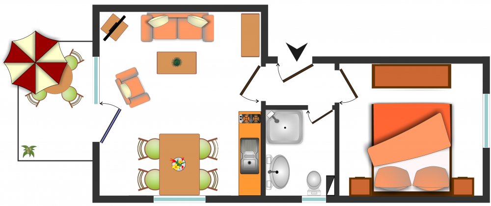 In der Ferienwohnung gibt es ein Wohn-/Esszimmer mit TV, sowie eine komplett ausgestattete Küchenzeile (Mikrowelle, Kaffeemaschine, Toaster) mit Esstisch und ein Bad mit DU/WC. Die Ferienwohnung ist hell und freundlich eingerichtet und hat eine möblierte Terrasse.